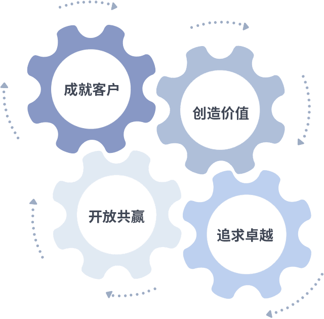 成就客户是一切决策的出发点,,,创造价值是衡量所有工作的标准,,,追求卓越是我们做事做人的态度,,,,开放共赢是我们的格局也是最终的结果。。价值观的齿轮环环相扣,,,,推动着组织里的每个人不断向前。。。