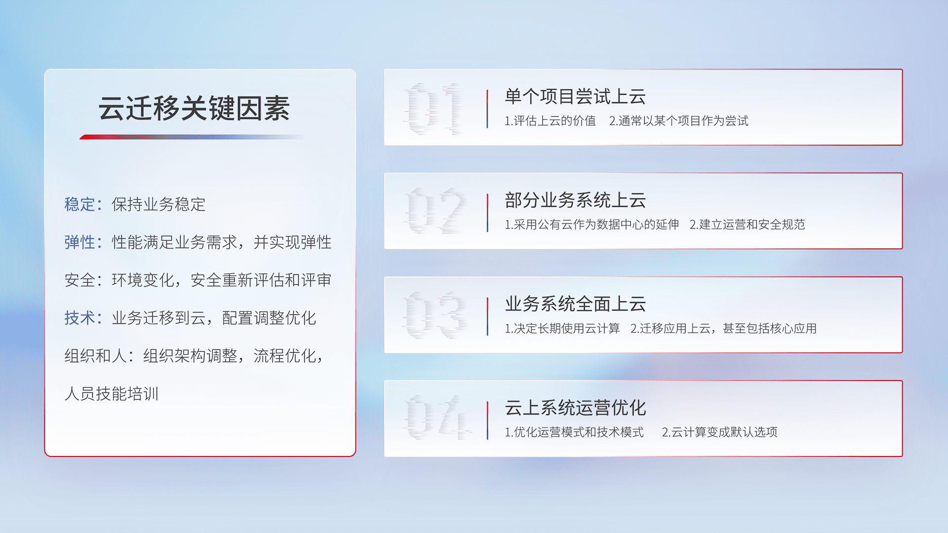 结合实际业务,,,,从规划设计、、云平台选型、、、云原生改造、、数据迁移、、、、集成交付,,,迁移全过程为客户识别最佳上云路径,,做好风险识别管理,,,设计网络架构、、身份权限、、安全审计合规、、、操作审计、、日志审计、、监控告警策略、、、多站点容灾设计等,,对云上基础设施进行整体规划,,,提升IT治理水平,,以满足弹性、、、高可用、、、高性能的需求。。。