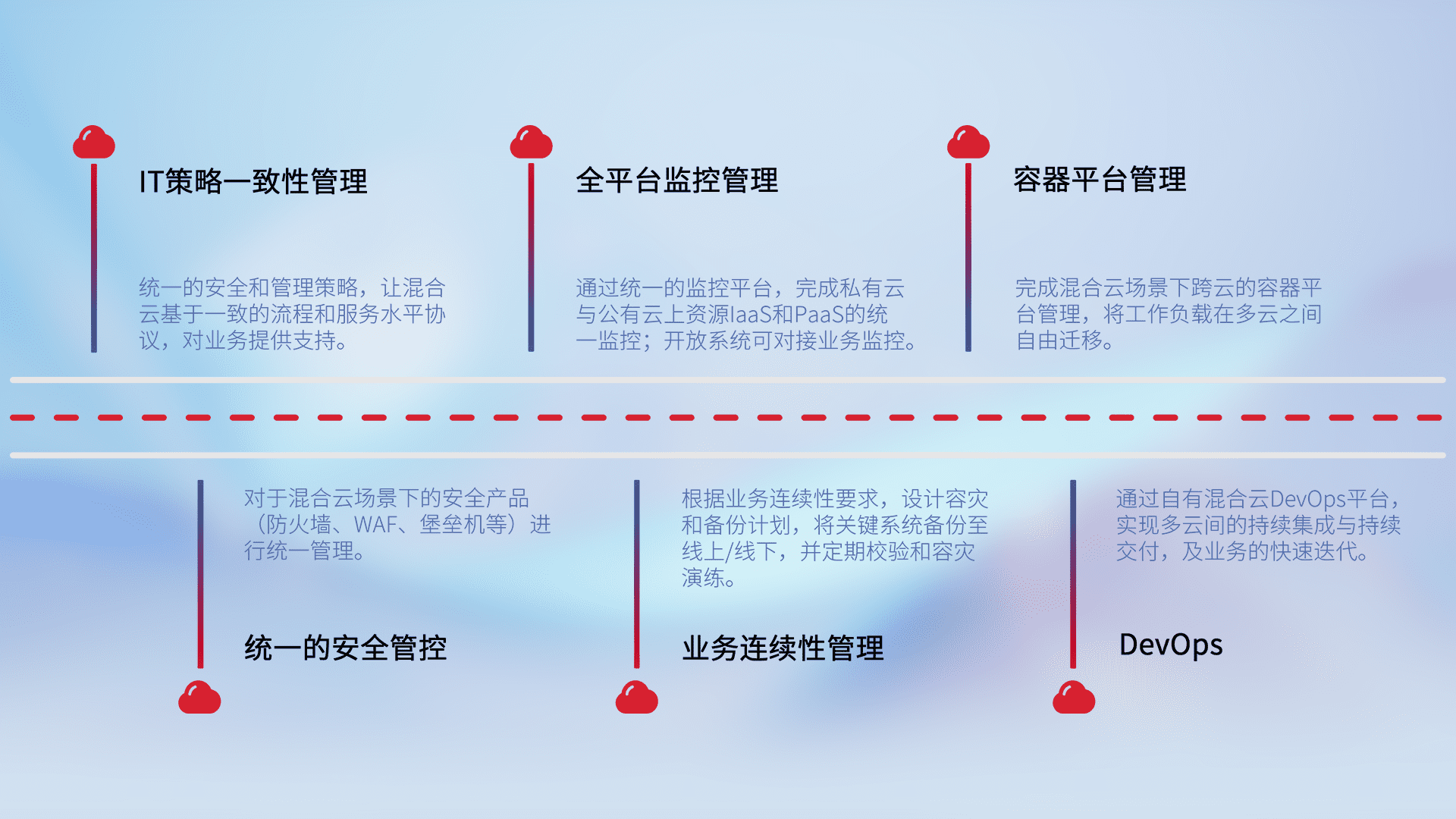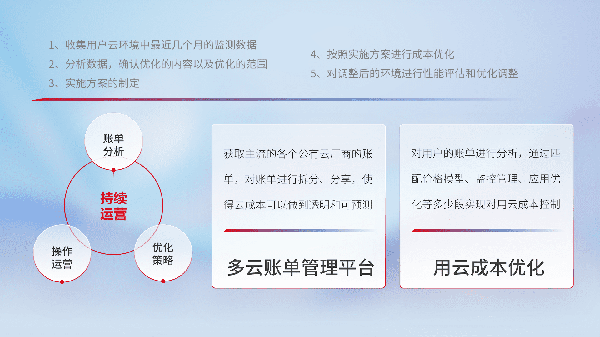通过多云纳管,,,,以统一的资源数据模型把客户的云资源进行抽象和封装,,,进而实现对多云资源的统一操作,,保障云资源管理的可靠性、、稳定性与可用性。。量身定制化运维内容,,配置、、、、开发运维、、、、补丁管理、、备份、、监控、、认证和访问管理、、、、审计和日常巡检等,,,,保障在用云过程中的可靠度,,稳定度以及高可用率。。。。